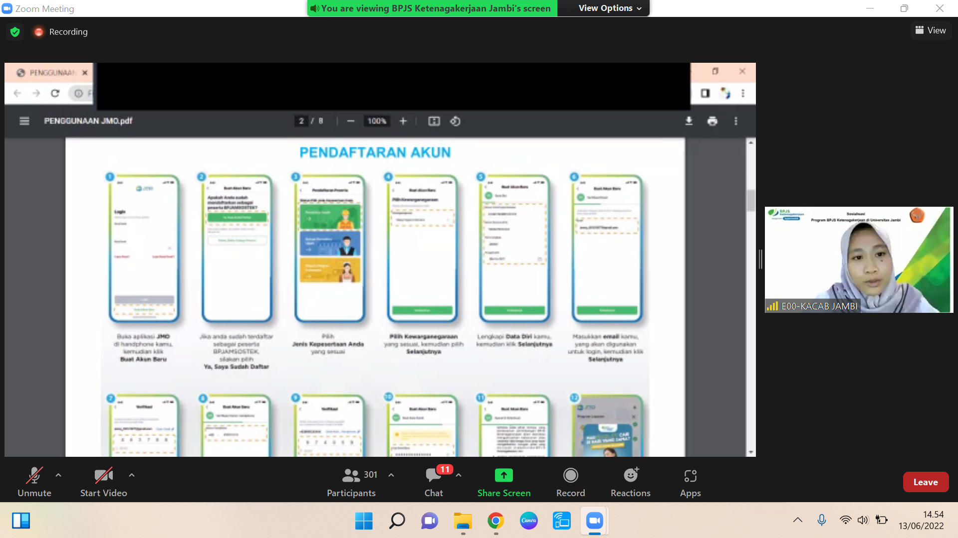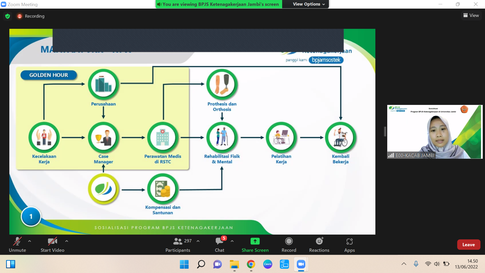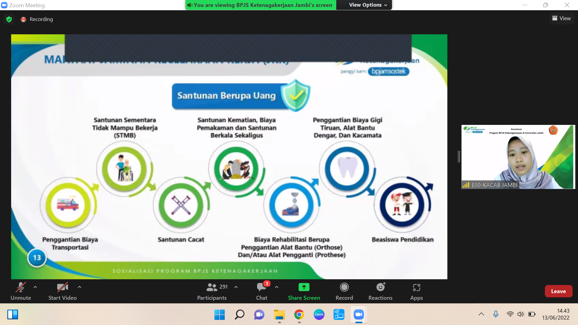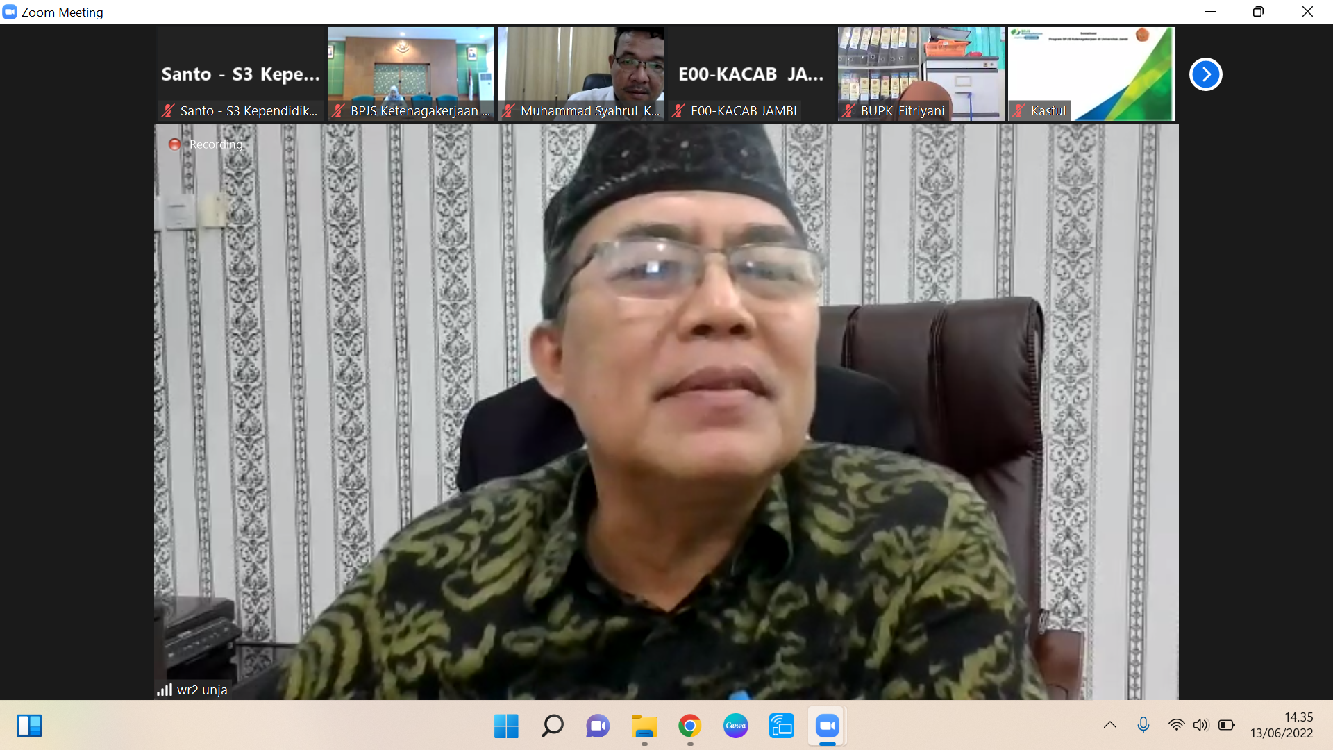 Staf Prodi Doktor Kependidikan ikuti sosialisasi Program BPJS Ketenagakerjaan yang diselenggarakan Universitas Jambi Senin siang, 13 Juni 2022. Kegiatan dibuka pukul 14.00 WIB oleh Tim BPJS Kantor Cabang Jambi. Kegiatan dihadiri oleh Ir. Yusrizal, M.Sc., Ph.D. selaku Wakil Rektor Bidang Umum & Keuangan Universitas Jambi.