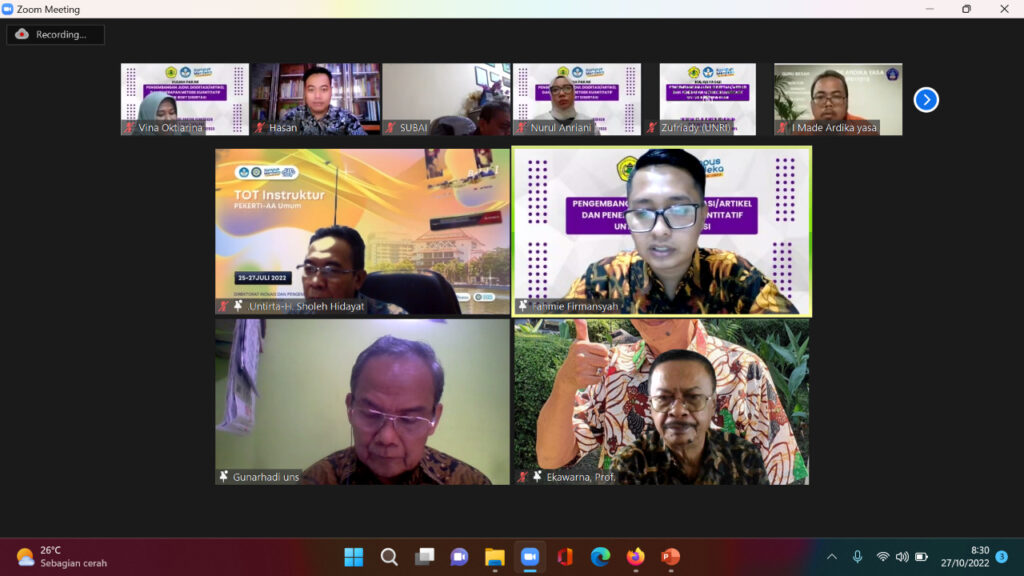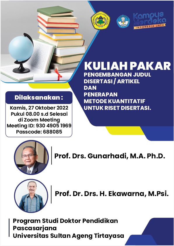 Dalam sebuah kolaborasi akademis yang luar biasa, Prof. Ekawarna dari Universitas Jambi (UNJA) dan Prof. Gunarhadi dari Universitas Sebelas Maret (UNS) bergabung untuk berbagi pengetahuan dan pengalaman mereka yang luas dalam serangkaian kuliah pakar. Kuliah Kepakaran yang diselenggarakan oleh Universitas Sultan Ageng Tirtayasa (UNTIRTA) ini berfokus pada aspek-aspek penting dalam pengembangan judul disertasi dan pemanfaatan metode penelitian kuantitatif untuk disertasi.