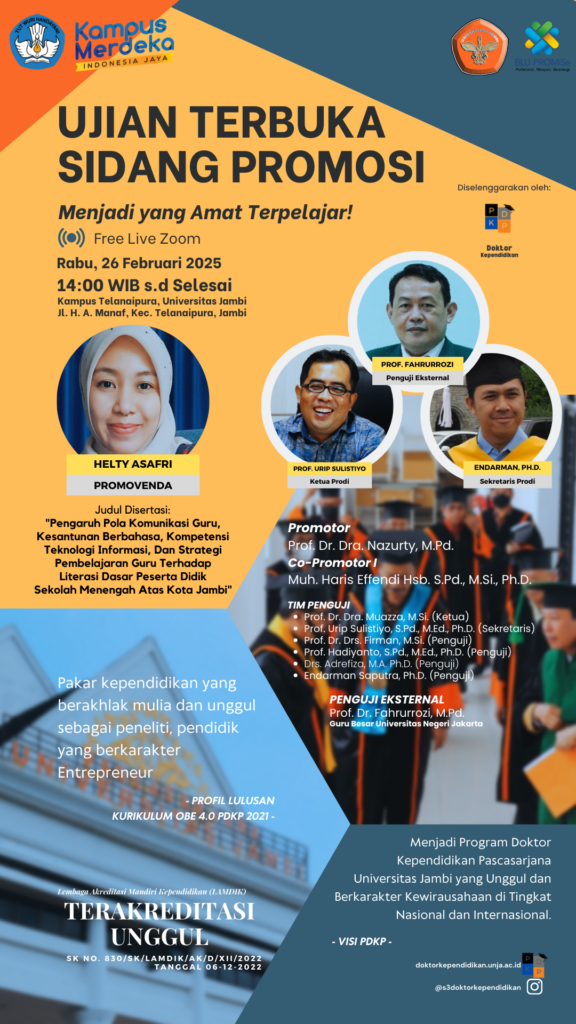 Sidang ini merupakan bagian dari tahapan akhir dalam penyelesaian studi doktoral yang akan menentukan kelulusan Helty. Disertasinya berjudul “PENGARUH POLA KOMUNIKASI GURU, KESANTUNAN BERBAHASA, KOMPETENSI TEKNOLOGI INFORMASI, DAN STRATEGI PEMBELAJARAN GURU TERHADAP LITERASI DASAR PESERTA DIDIK SEKOLAH MENENGAH ATAS KOTA JAMBI.”