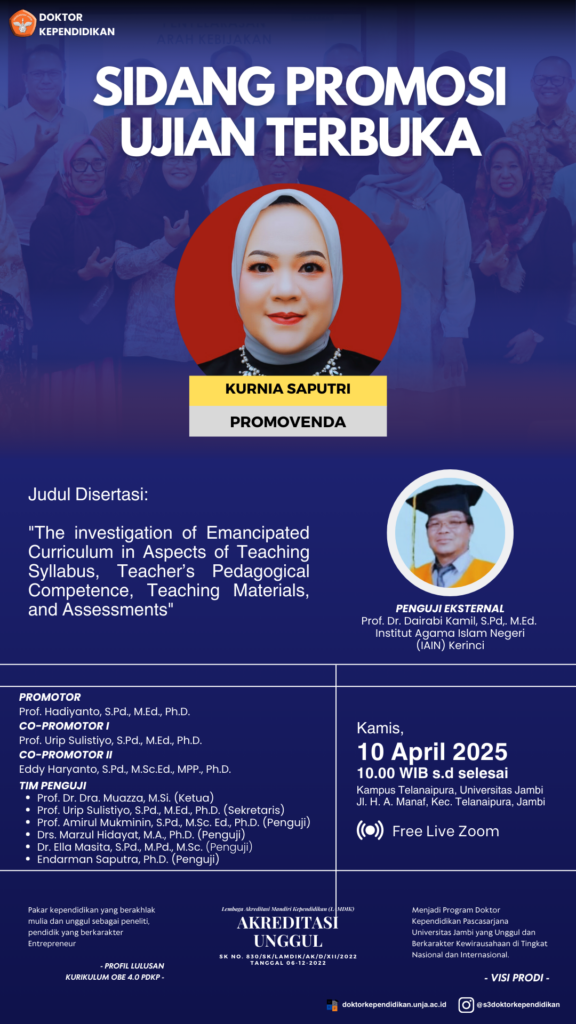 Program Studi Doktor Kependidikan Pascasarjana Universitas Jambi dengan bangga mengumumkan pelaksanaan Ujian Terbuka Promosi Doktor atas nama: