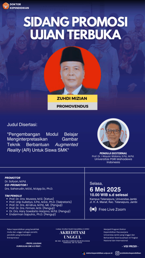 Ujian terbuka ini bersifat publik dan terbuka bagi sivitas akademika serta masyarakat umum yang tertarik dengan pengembangan teknologi pendidikan berbasis AR. Mari kita dukung dan saksikan momen penting ini dalam perjalanan akademik Zuhdi Mizian menuju gelar Doktor Kependidikan.